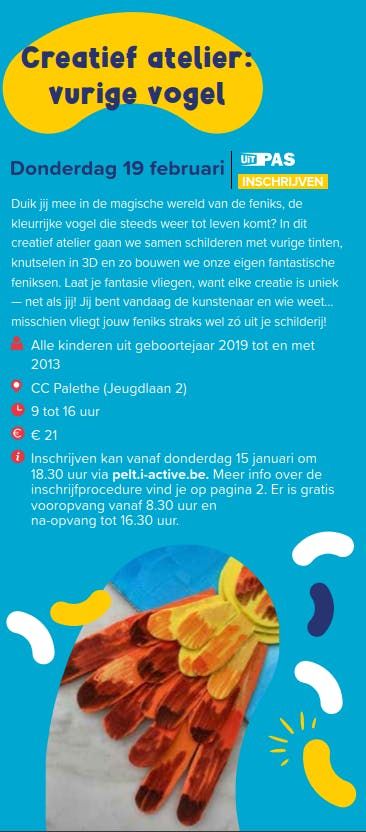 Duik jij mee in de magische wereld van de feniks, de kleurrijke vogel die steeds weer tot leven komt? In dit creatief atelier gaan we samen schilderen met vurige tinten, knutselen in 3D en zo bouwen we onze eigen fantastische feniksen. Laat je fantasie vliegen, want elke creatie is uniek - net als jij! Jij bent vandaag de kunstenaar en wie weet... misschien vliegt jouw feniks straks wel zo uit je schilderij!