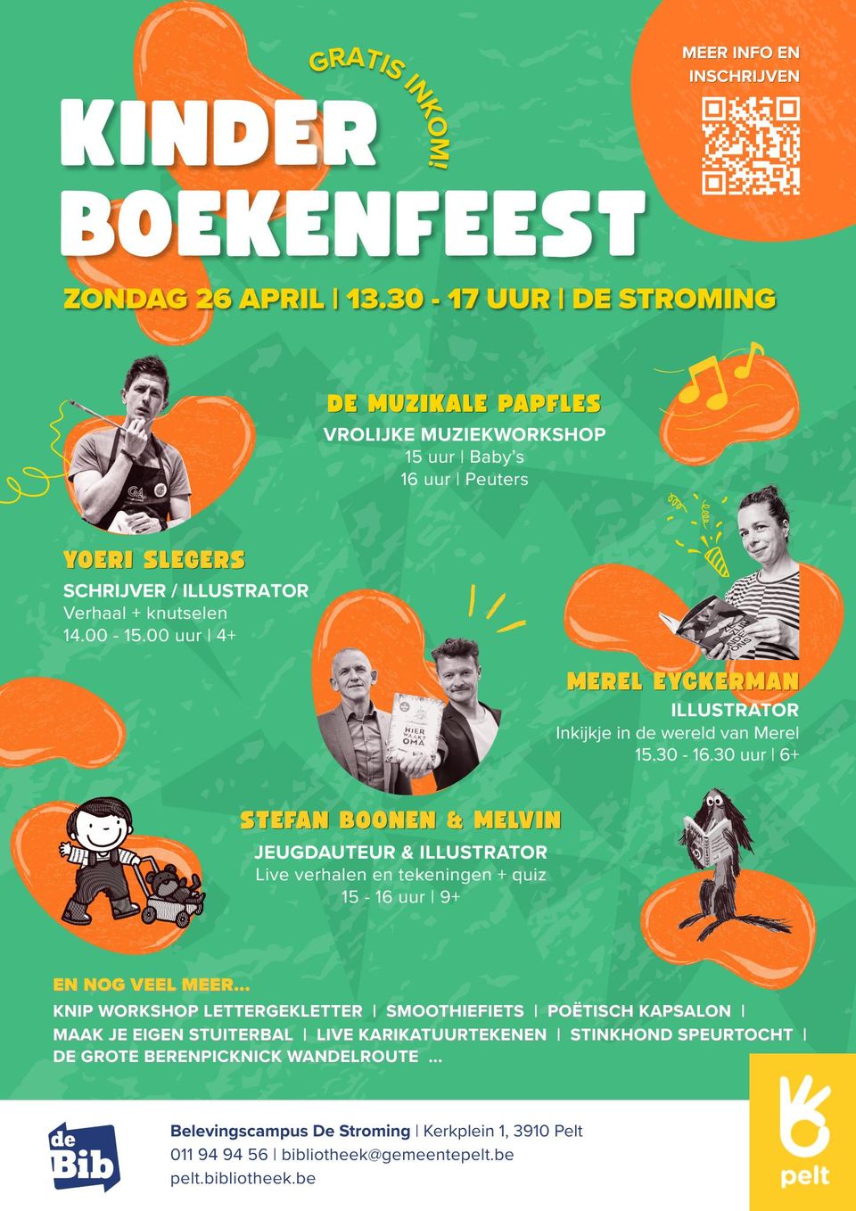 - Stefan Boonen & Melvin – Graphic novels live | 15.00 – 16.00 | 9+ | Stefan Boonen & Melvin maken samen 'graphic novels' voor kinderen. Het zijn verhalen vol verbeelding, emotie en humor. Er wordt verteld en live getekend en met wat geluk is er ook een quiz!